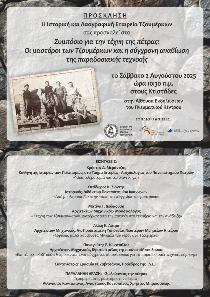 Η Πρόεδρος και τα Μέλη του Δ.Σ. της Ι.Λ.Ε.Τ., σας προσκαλούμε στο Συμπόσιο για την τέχνη της πέτρας, με θέμα: «οι μαστόροι των Τζουμέρκων και η σύγχρονη αναβίωση της παραδοσιακής τεχνικής», που θα πραγματοποιηθεί στους Κτιστάδες, το Σάββατο 2 Αυγούστου 2025 και ώρα 10:30 π.μ. στην αίθουσα εκδηλώσεων του Πνευματικού Κέντρου. Το συμπόσιο διοργανώνεται με σκοπό την ανάδειξη της τοπικής αρχιτεκτονικής και τη γνωριμία του κοινού με τη ζωή και το έργο των παλιών Τζουμερκιωτών μαστόρων της πέτρας, σε μια προσπάθεια αναβίωσης και αναδημιουργίας της παραδοσιακής τεχνικής.